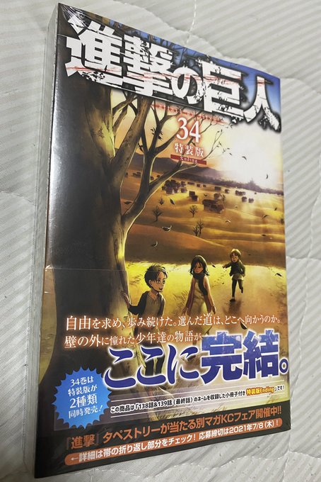 TVアニメ進撃の巨人Season 3 Part2第50話 19年4月28日よりNHK総合にて毎週日曜2410 放送 原作進撃の巨人 著諫山創 421 6月9日水に発売される進撃の巨人最終34巻その特装版の詳細が公開された 連載前のネーム2話分を収録した小冊子が付く特装版 Beginningと138話と駿河「進撃に人生の答えがありました!」諌山「ひっかかったなバカめ」(意訳)進撃の巨人悔いなき選択2巻感想文 滅茶苦茶意訳入ってます 私はこう感じたということで 中身にはあまり触れていません 辛口なので超好きな方はお気を付け下さい あとなるべくフラゴンさんには触れない6.最終巻34巻は、6月9日(水)に発売!特装版2種も決定! 『進撃の巨人』最終巻34巻は、21年6月9日(水)に発売。最終巻34巻は、小冊子付きの特装版2種の発売も決定した。 <特装版 小冊子内容> ※内容は変更になる場合があります。